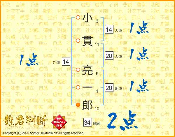 小(3画)貫(11画) 亮(9画)一(1画)郎(10画)
