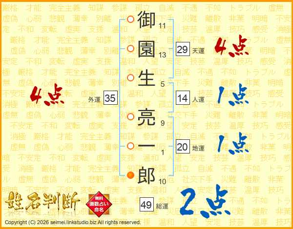 御(11画)園(13画)生(5画) 亮(9画)一(1画)郎(10画)
