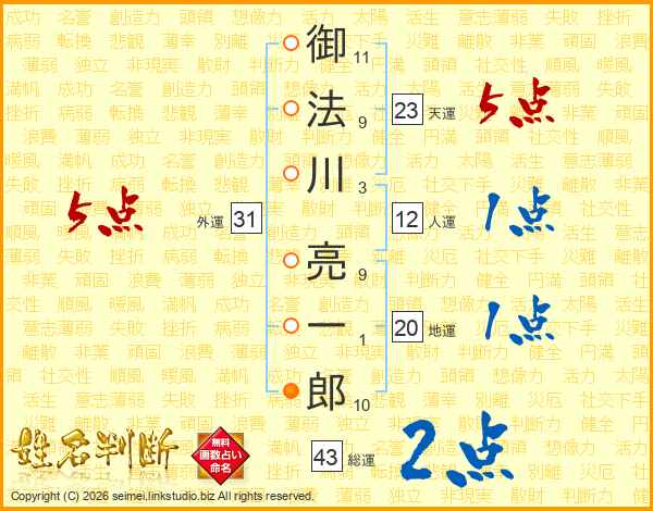 御法川亮一郎さんの総運は43画の2点!