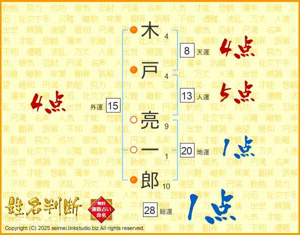 木(4画)戸(4画) 亮(9画)一(1画)郎(10画)