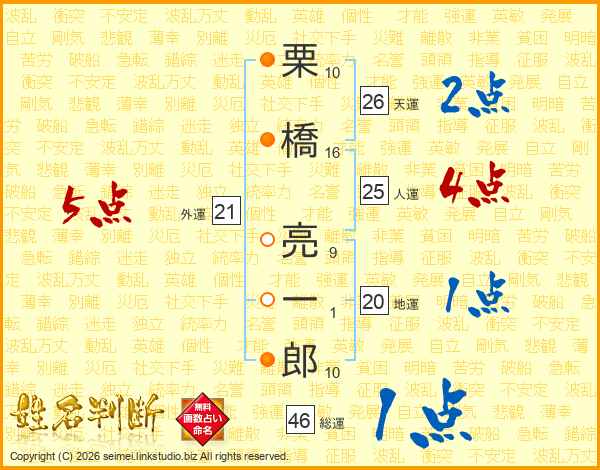 栗(10画)橋(16画) 亮(9画)一(1画)郎(10画)