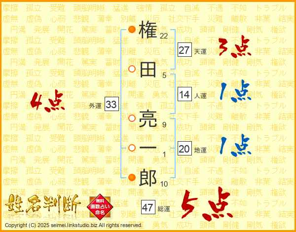 権(22画)田(5画) 亮(9画)一(1画)郎(10画)
