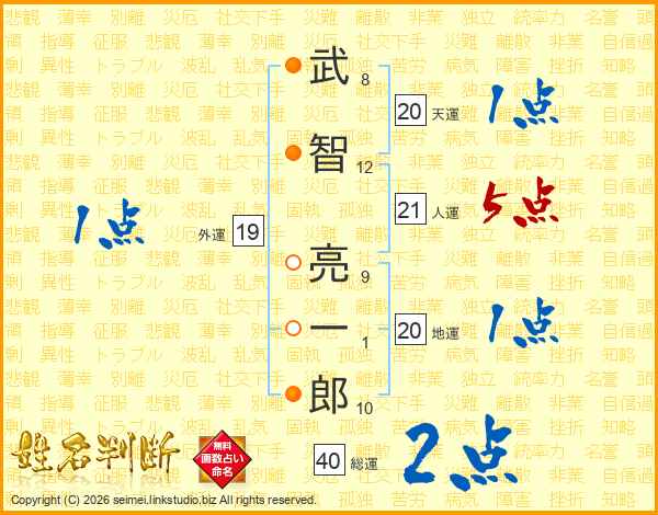 武(8画)智(12画) 亮(9画)一(1画)郎(10画)