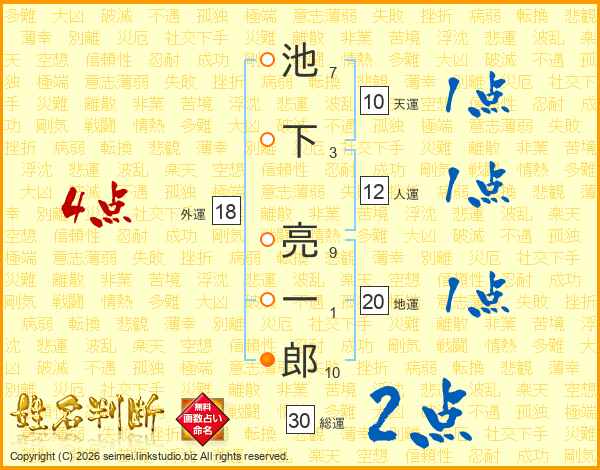 池(7画)下(3画) 亮(9画)一(1画)郎(10画)