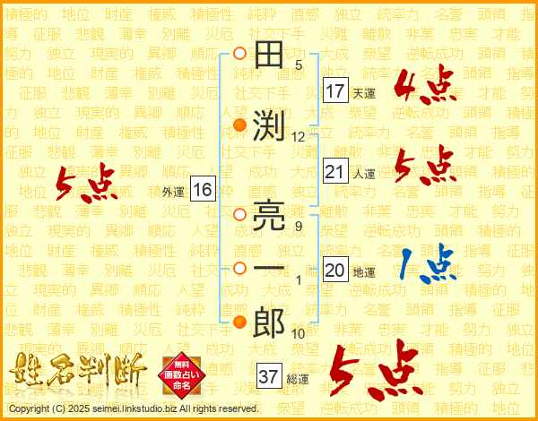田(5画)渕(12画) 亮(9画)一(1画)郎(10画)