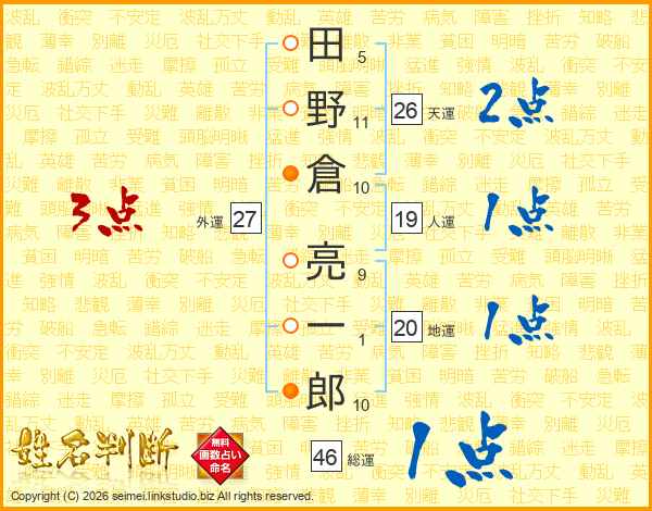 田(5画)野(11画)倉(10画) 亮(9画)一(1画)郎(10画)