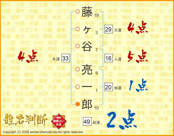 藤ヶ谷亮一郎さんの総運は49画の2点!