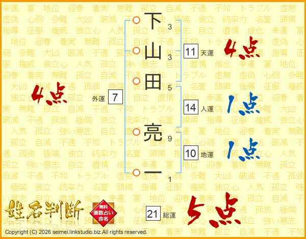 下山田亮一さんの総運は21画の5点!