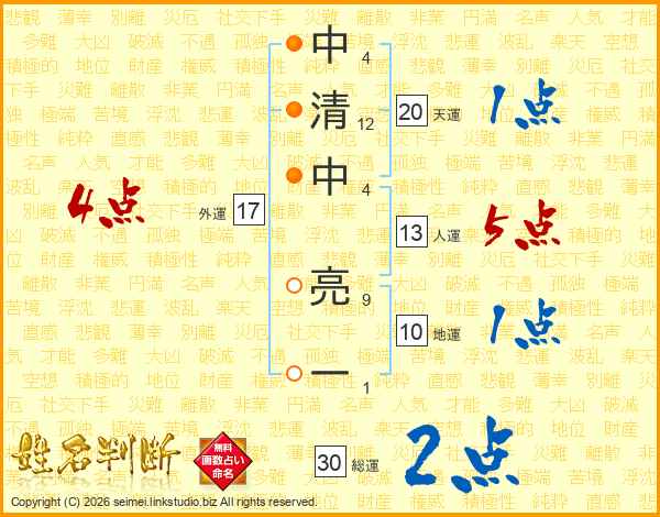 中(4画)清(12画)中(4画) 亮(9画)一(1画)
