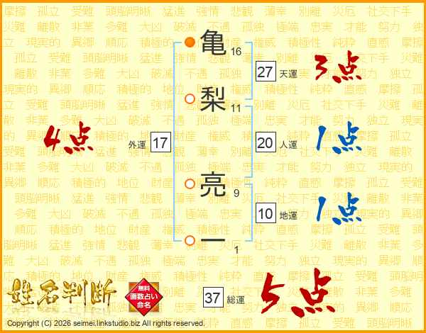 亀梨亮一さんの総運は37画の5点!