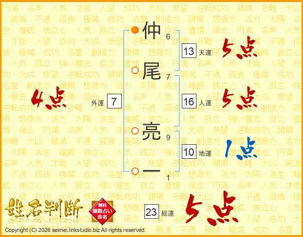 仲(6画)尾(7画) 亮(9画)一(1画)