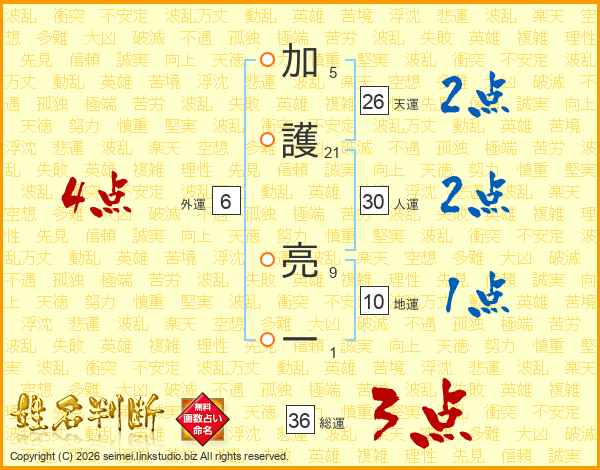 生活面を象徴する運勢です。外部から受ける影響力を表し、結婚運、家庭運や職場、環境への順応性を表します。総運から人運を引いた画数。姓や名が1文字の場合を除く。