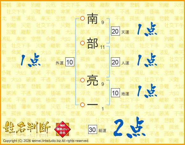 生活面を象徴する運勢です。外部から受ける影響力を表し、結婚運、家庭運や職場、環境への順応性を表します。総運から人運を引いた画数。姓や名が1文字の場合を除く。