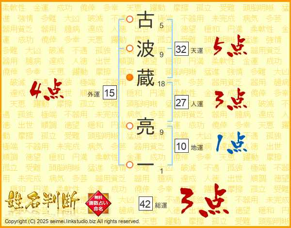 古(5画)波(9画)蔵(18画) 亮(9画)一(1画)