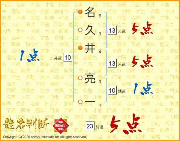 名(6画)久(3画)井(4画) 亮(9画)一(1画)