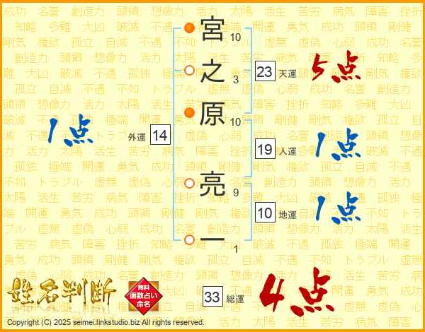 宮(10画)之(3画)原(10画) 亮(9画)一(1画)