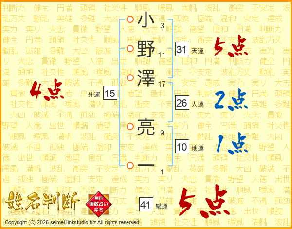 小野澤亮一さんの総運は41画の5点!