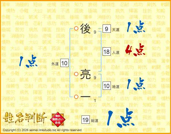 後(9画) 亮(9画)一(1画)
