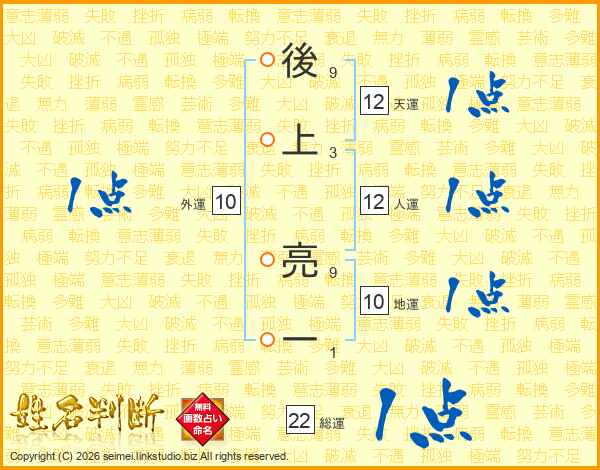 後上亮一さんの総運は22画の1点!