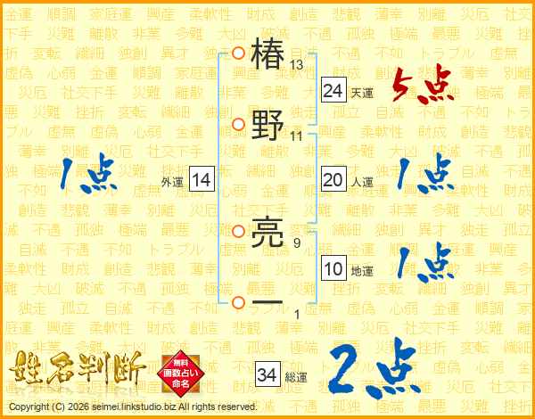 生活面を象徴する運勢です。外部から受ける影響力を表し、結婚運、家庭運や職場、環境への順応性を表します。総運から人運を引いた画数。姓や名が1文字の場合を除く。