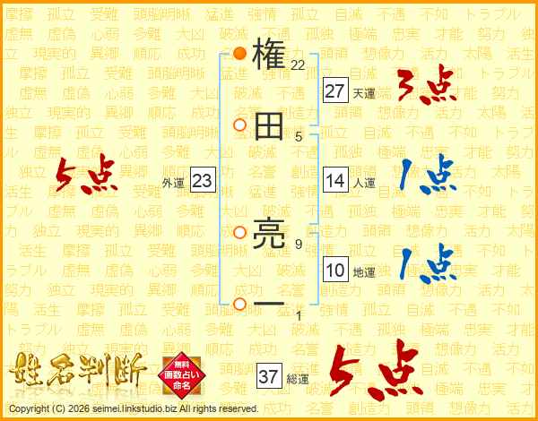 生活面を象徴する運勢です。外部から受ける影響力を表し、結婚運、家庭運や職場、環境への順応性を表します。総運から人運を引いた画数。姓や名が1文字の場合を除く。