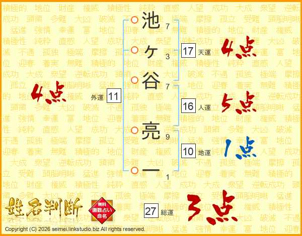 池(7画)ヶ(3画)谷(7画) 亮(9画)一(1画)