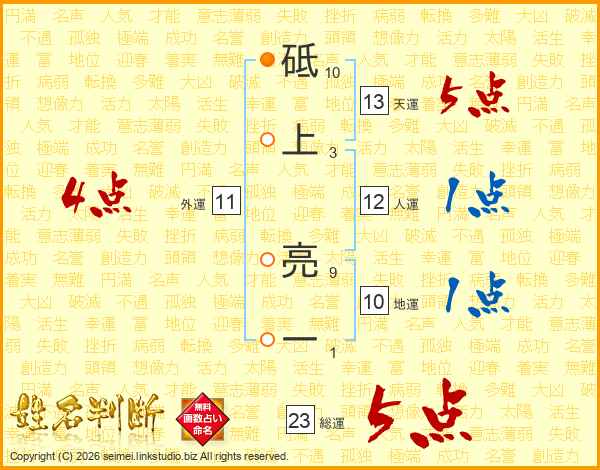 砥上亮一さんの総運は23画の5点!