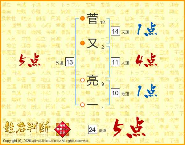 生活面を象徴する運勢です。外部から受ける影響力を表し、結婚運、家庭運や職場、環境への順応性を表します。総運から人運を引いた画数。姓や名が1文字の場合を除く。