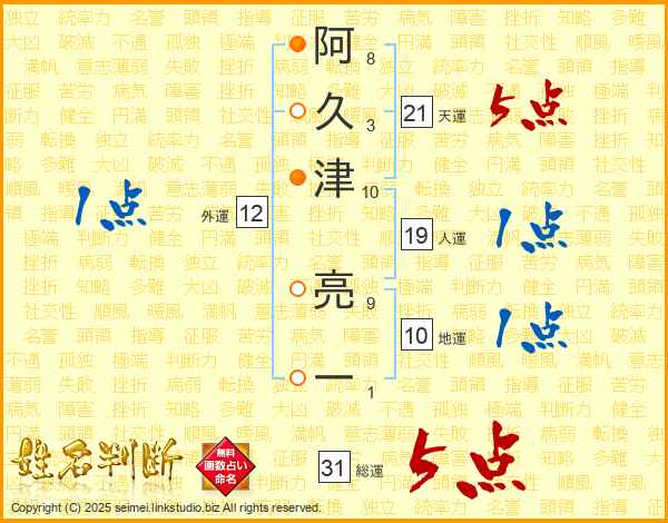 阿(8画)久(3画)津(10画) 亮(9画)一(1画)