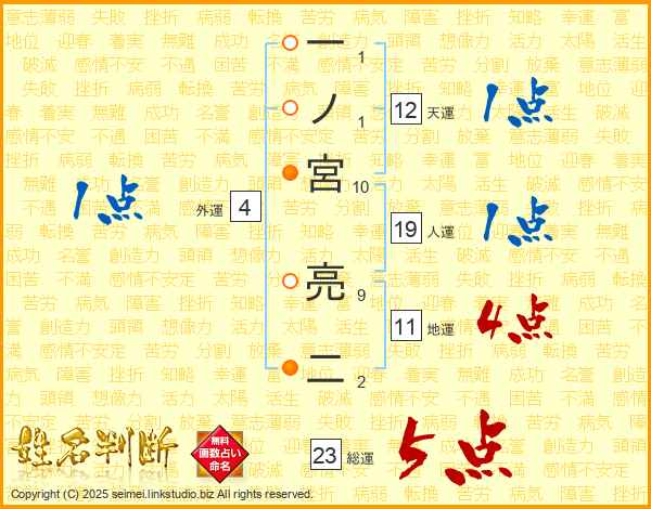 一(1画)ノ(1画)宮(10画) 亮(9画)二(2画)