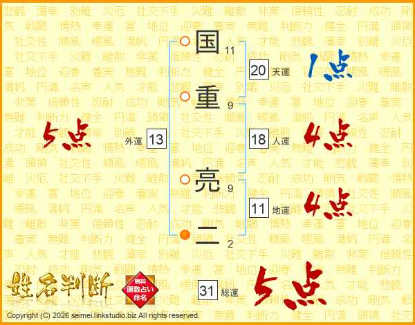 国重亮二さんの総運は31画の5点!