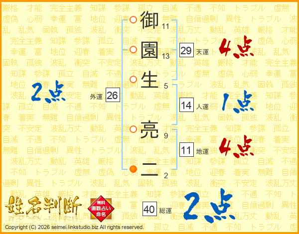 御(11画)園(13画)生(5画) 亮(9画)二(2画)