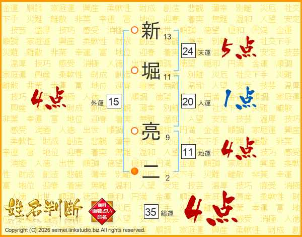 新(13画)堀(11画) 亮(9画)二(2画)