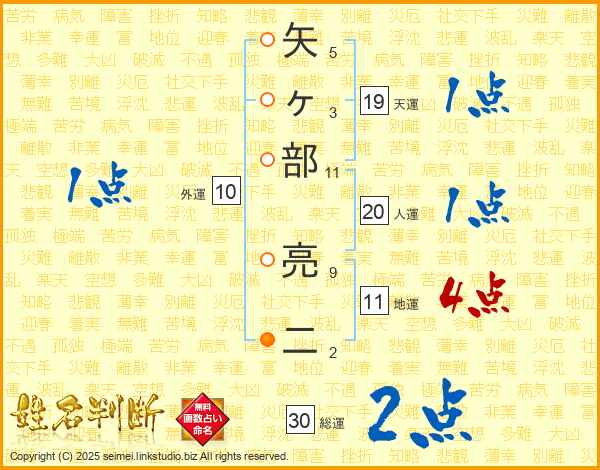 矢(5画)ヶ(3画)部(11画) 亮(9画)二(2画)