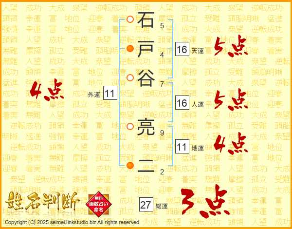 石(5画)戸(4画)谷(7画) 亮(9画)二(2画)