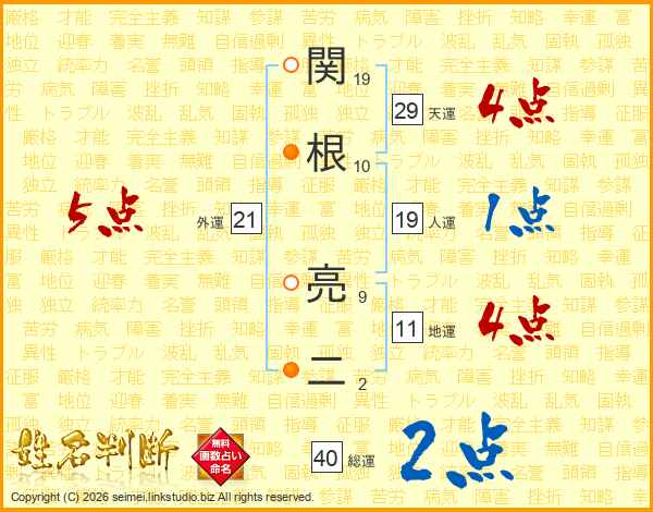 あなたの人生を表す1番重要な運勢です。生涯を通じて影響する総合運となり、主に50歳以降の晩年期に影響を及ぼします。苗字と名前の合計画数。