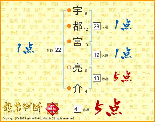 宇都宮亮介さんの総運は41画の5点!