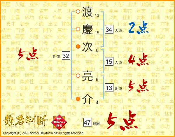 渡(13画)慶(15画)次(6画) 亮(9画)介(4画)