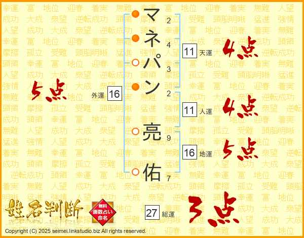 マ(2画)ネ(4画)パ(3画)ン(2画) 亮(9画)佑(7画)