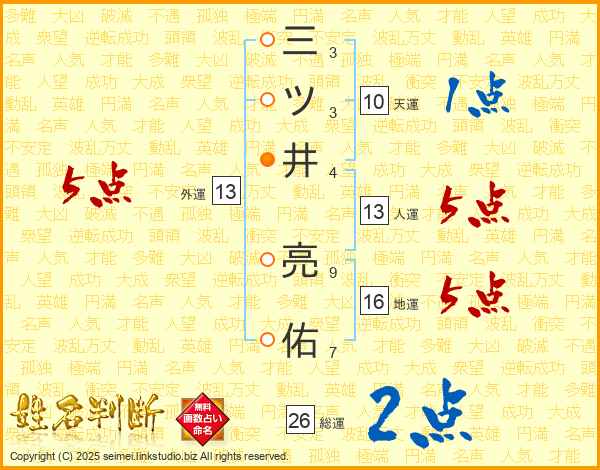 三(3画)ツ(3画)井(4画) 亮(9画)佑(7画)