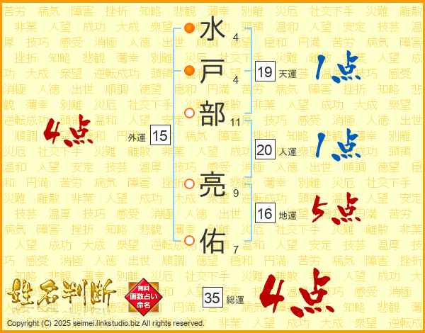 水(4画)戸(4画)部(11画) 亮(9画)佑(7画)