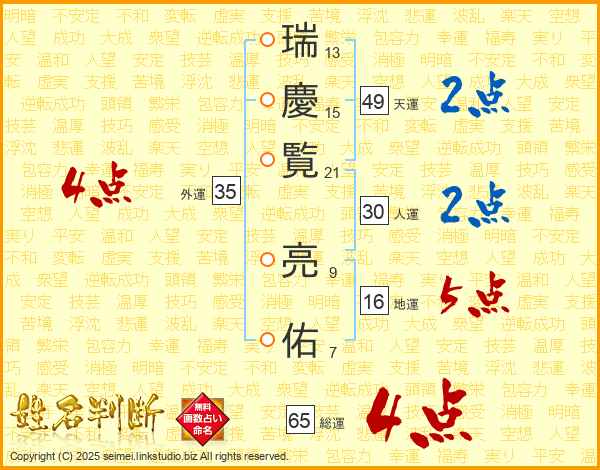瑞(13画)慶(15画)覧(21画) 亮(9画)佑(7画)