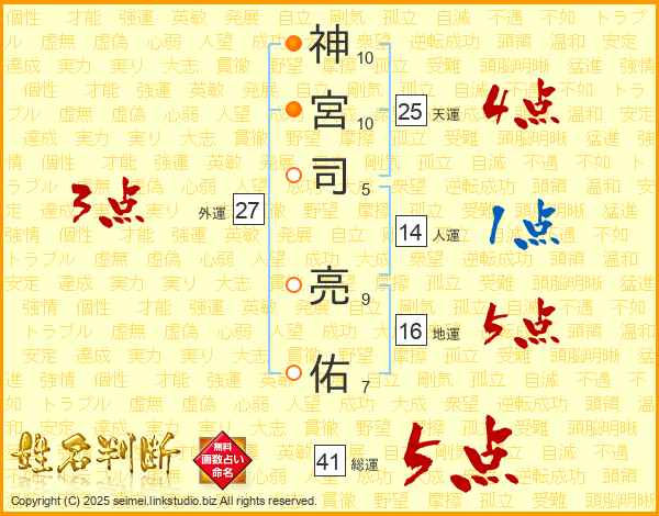 神(10画)宮(10画)司(5画) 亮(9画)佑(7画)