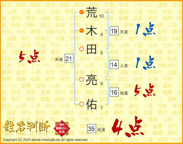 荒(10画)木(4画)田(5画) 亮(9画)佑(7画)