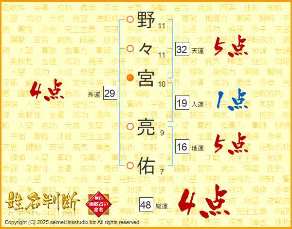 野(11画)々(11画)宮(10画) 亮(9画)佑(7画)