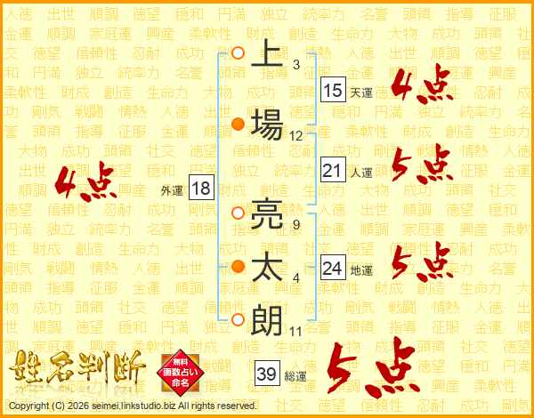 上場亮太朗さんの総運は39画の5点!