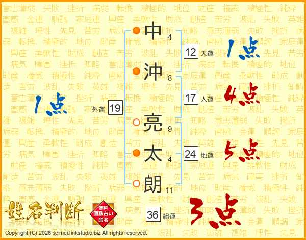 中(4画)沖(8画) 亮(9画)太(4画)朗(11画)