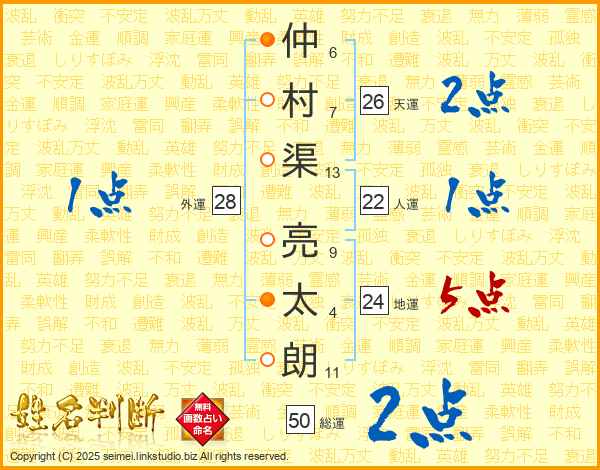 仲(6画)村(7画)渠(13画) 亮(9画)太(4画)朗(11画)