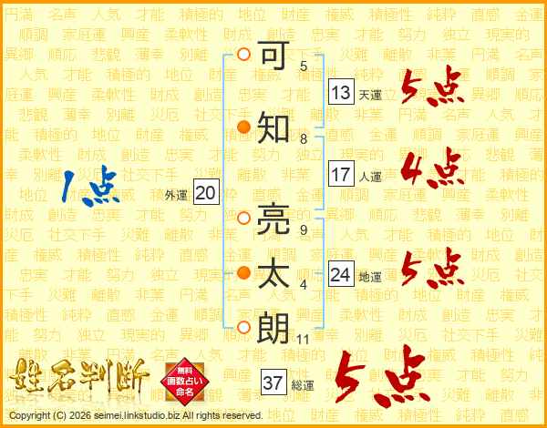 可(5画)知(8画) 亮(9画)太(4画)朗(11画)