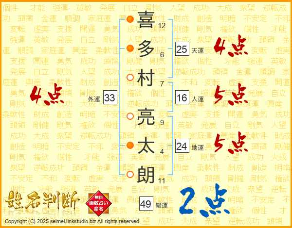 喜(12画)多(6画)村(7画) 亮(9画)太(4画)朗(11画)
